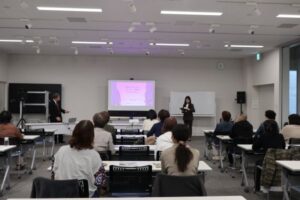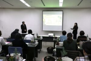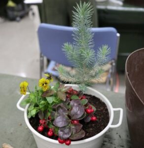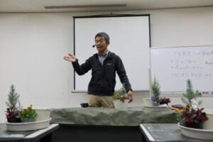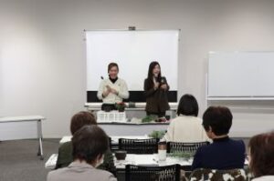 第2部のカルチャー講座は、境港会場ではOne Senseの地頭曜子氏を招き、『華やかさで魔法をかける! クリスマスアレンジメント』と題し、バラ、カーネーション、ガーベラ、さつま杉、ブルーアイス、キラキラ松ぼっくりを使い、クリスマスを意識した目にする度に心躍るアレンジメントを作成しました。また、米子会場ではとっとり花回廊の職員さまより『クリスマスを演出する冬の寄せ植え』と題し、こちらもコニファー、チェッカーベリー、ビオラ・タイガーを使いたクリスマスのわくわく気分を盛り上げる寄せ植えに挑戦しました。
